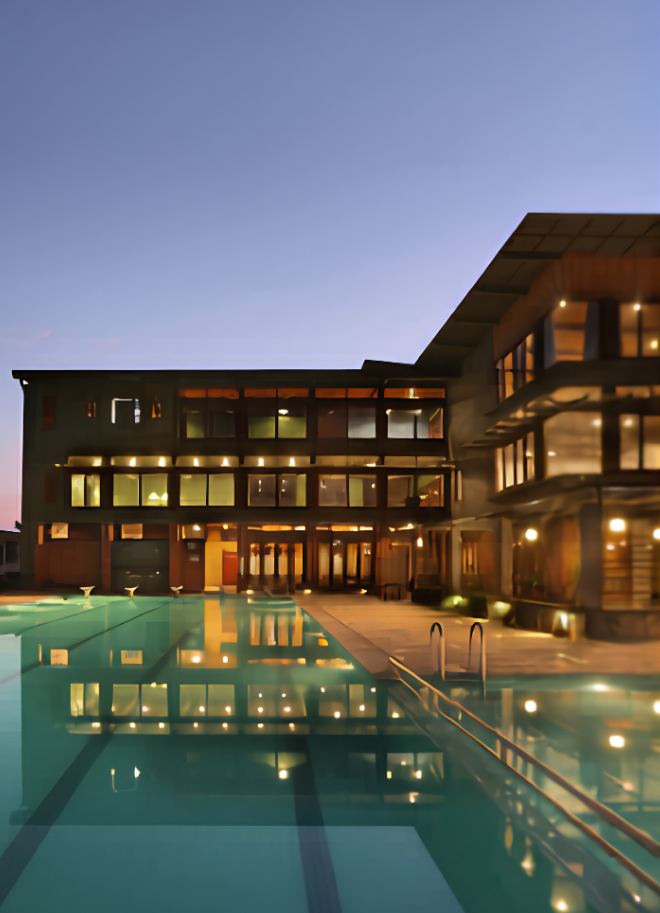 The club is designed as a series of spaces around open spaces’ beautifully landscaped water court forms theentrance to the club. The transition spaces are designed overlooking the water court. The walls are
